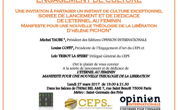 Made by Futuria Production La Soirée de lancement du livre "L’ETERNEL AU FEMININ" a eu lieu le Lundi 27 Mars 2017 à l'Hôtel Bel Ami Rue Saint Benoit - Paris Manifeste pour une nouvelle théologie de la libération d’Hélène PICHON avec Opinion Internationale et Futuria...