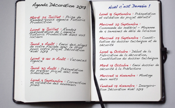 Futuria Production, en simulant un agenda rendez-vous, vous démontre que pour réaliser un évènement dans les temps pour les fêtes de fin d'année, le Vendredi 28 Juillet est déjà la veille de "Noël" !